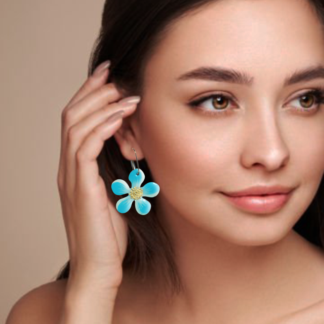 model-A Published December 15, 2025 at 1080 × 1080 in Sky Blue Floral Handmade Earrings – Lightweight Wooden Drop Earrings for Women (Copy) ← Previous Next →